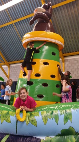 Op donderdag 20 april waren er de Koningsspelen voor Het Klimduin. De bovenbouw ging op de fiets naar het zwembad, waar eerst, in de tennishal van De Beeck, uitgebreid gespeeld kon worden op, in en tussen opgeblazen speeltoestelen. Geweldig! Er was een apenboom met bananen, een voetbalveld en een hindernisbaan.